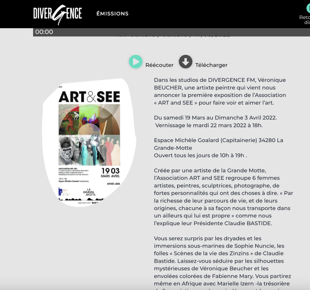 RADIO DIVERGENCE 93.9 fm a interviewé Véronique Beucher, une des artistes d’ART and SEE au sujet de la première exposition de cette association à La Grande-Motte.