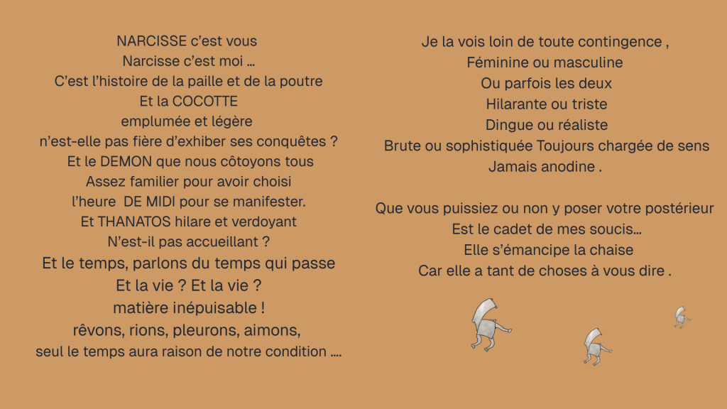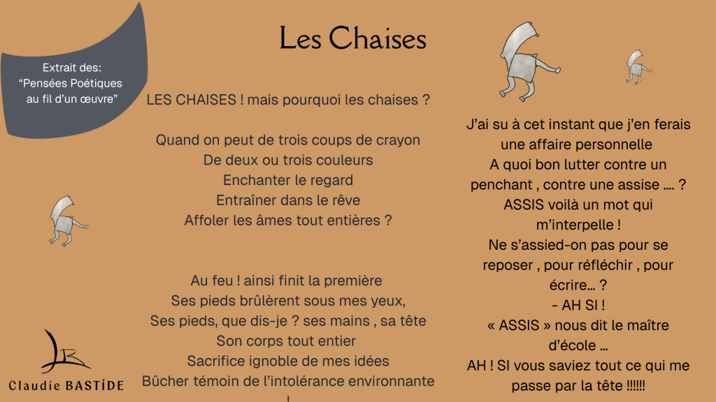 Avant de vous présenter ce que j’appelle mes « sculptures sur chaises », je tenais à vous faire part de ma réponse à une question qui m’est souvent posée à leur sujet:
